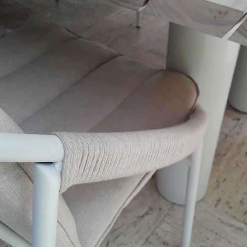 Com estrutura em alumínio, a peça parte de um desenho de linhas simples e fluídas, que se transforma conforme recebe novos elementos. Ganha vida com o acréscimo do braço, do estofamento nos apoios laterais e no assento e encosto, resultando em uma composição equilibrada entre leveza, conforto e estilo.